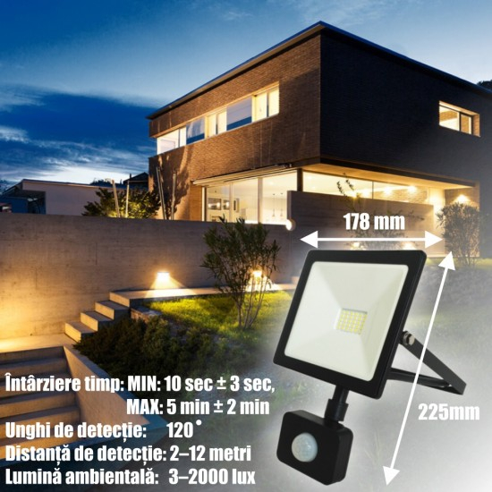 Specificatii tehnice Caracteristici senzor de miscare Consum in standby <0.1w Distanta detectie ajustabila 2 - 10m Inaltime instalare 1.8 - 2.5m Timp functionare reglabil 10sec. - 5min. Unghi detectie 120 grade Specificatii Consum(W) 50W Putere (W) 50W Dimensiune 225x178x45mm Material Aluminiu Dimabil Nu Indice de Protectie IP65 Echivalenta consum bec traditional 50w=200w Durata Medie De Viata 15.000 Ore Clasa Energetica F Tehnologie LED Tip produs Proiector Led Caracteristici Optice Lumeni 4500 Lm Culoare lumina Lumina Rece Unghi Lumina 120 grade Kelvin 6500K CRI (RA) >80 Alimentare Tensiune intrare (V) 220-240V