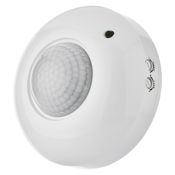 Senzor de miscare slim, infrarosu, IP20, unghi de detectie 360 de grade, culoare alba. Senzorul de miscare cu infrarosu, de la Emos, este ideal pentru supravegherea spatiilor interioare, precum: holuri, casa scarilor, pivnite, garaje, subsoluri, anexe, vitrine de magazin s.a. Datorita unghiului de detectie de 360 de grade, a distantei de detectie de maximum 6 metri, si a duratei de actionare (de la 10 secunde pana la 7 minute), va puteti bucura de o modalitate eficienta de iluminare a incaperii, evitand risipa de energie.