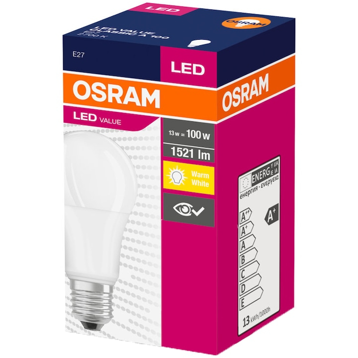 Tip bec: LED Clasic Forma Standard Culoare Alb Clasa eficienta energetica Clasa F Tensiune alimentare 230 V Putere 13 W Putere echivalenta: 100 W Tip dulie: Edison Tip soclu: E27 Tip lumina: Calda Temperatura culoare 2700 k Indice redare culori (Ra) 80 Flux luminos 1521lm Dimensiuni Diametru 60 mm Inaltime 118 mm Greutate 74.6 g